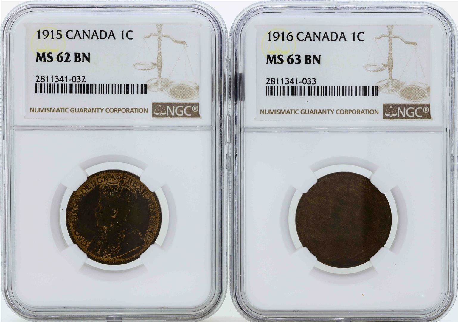 One Lot of (2) Canada One Cent Coins NGC MS63BN. NGC Certified.