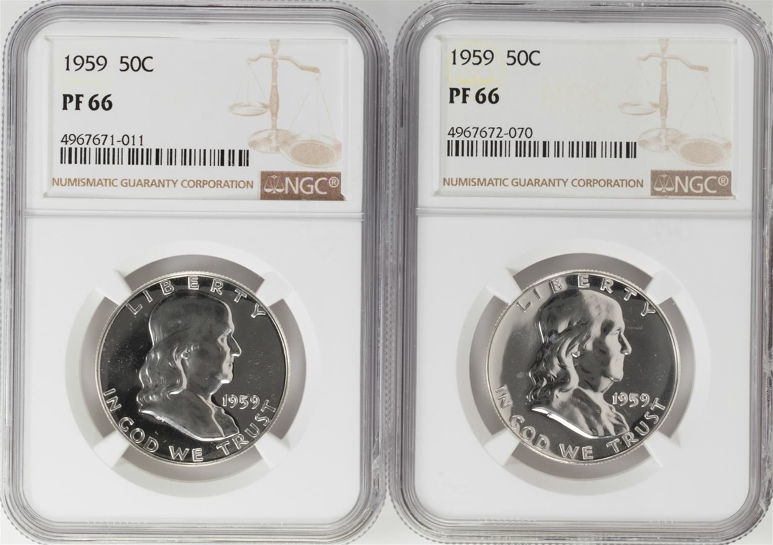One Lot of (2) Chipped Slabs 1959 Proof Franklin Half Dollar Coins NGC PF66. NGC Certified.