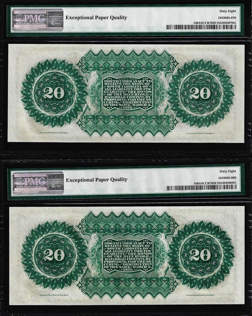 One Lot of (2) Consec. 1872 $20 South Carolina Obsolete Notes PMG Superb Gem Unc. 68EPQ. PMG Certified.