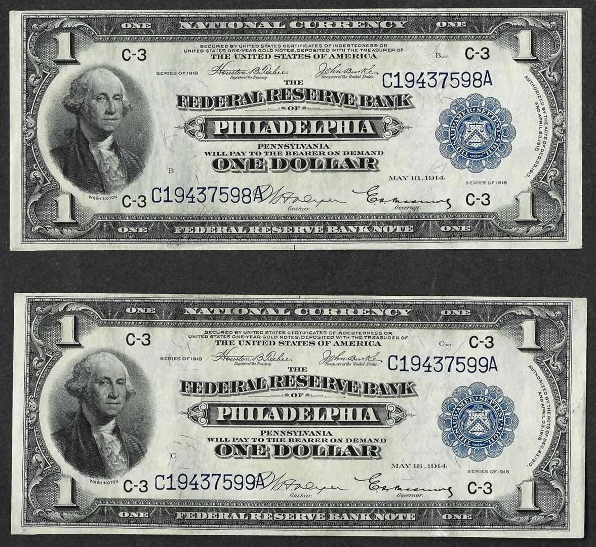 Lot of (2) Consecutive 1918 $1 Federal Reserve Bank Notes Philadelphia