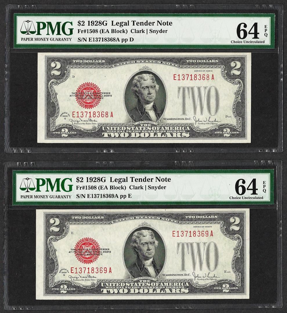 Lot of (2) Consecutive 1928G $2 Legal Tender Notes PMG Choice Uncirculated 64EP