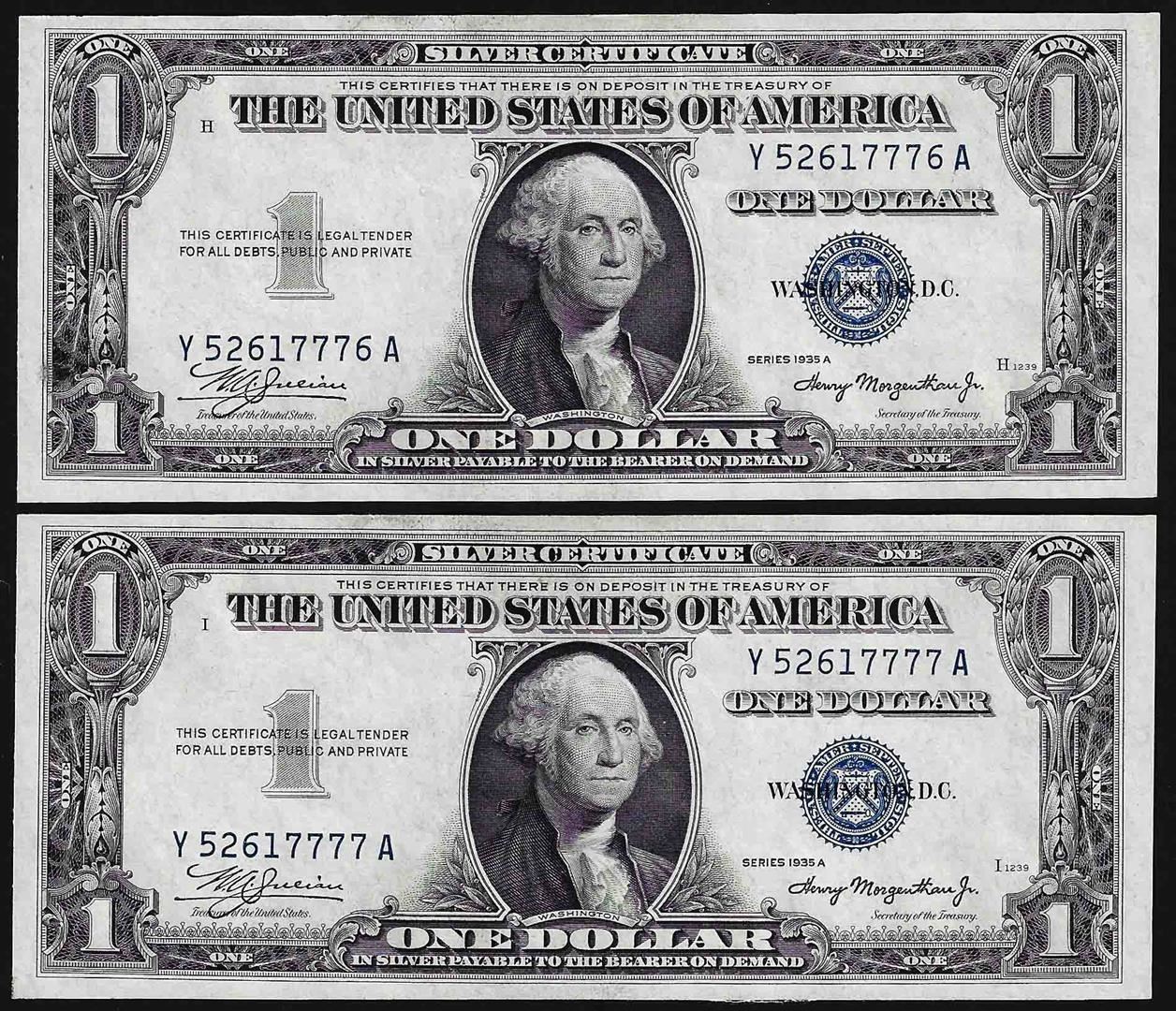 Lot of (2) Consecutive 1935A $1 Silver Certificate Notes Uncirculated