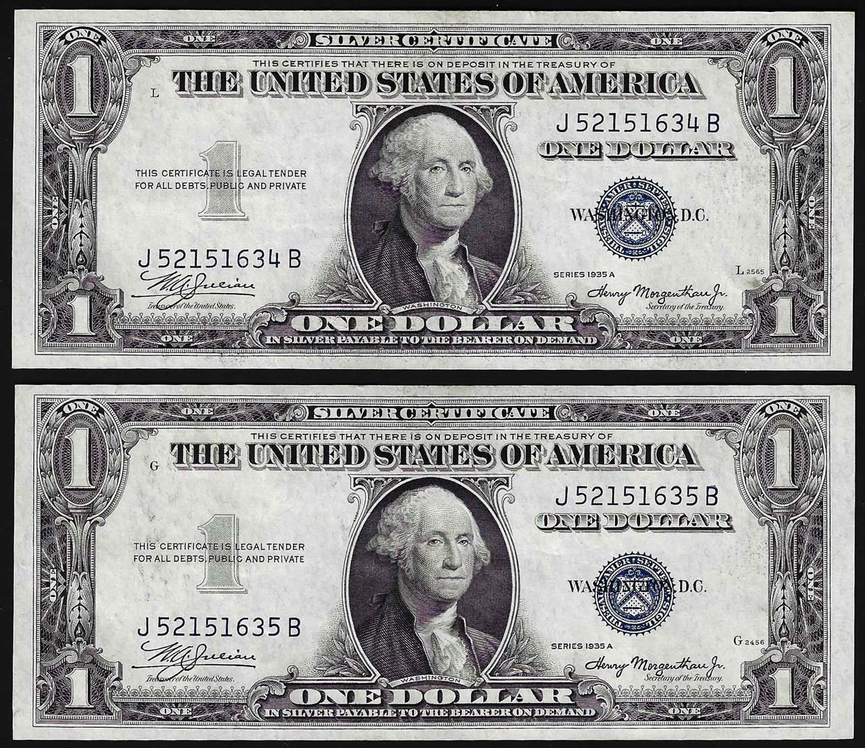 One Lot of (2) Consecutive 1935A $1 Silver Certificate Notes Uncirculated.