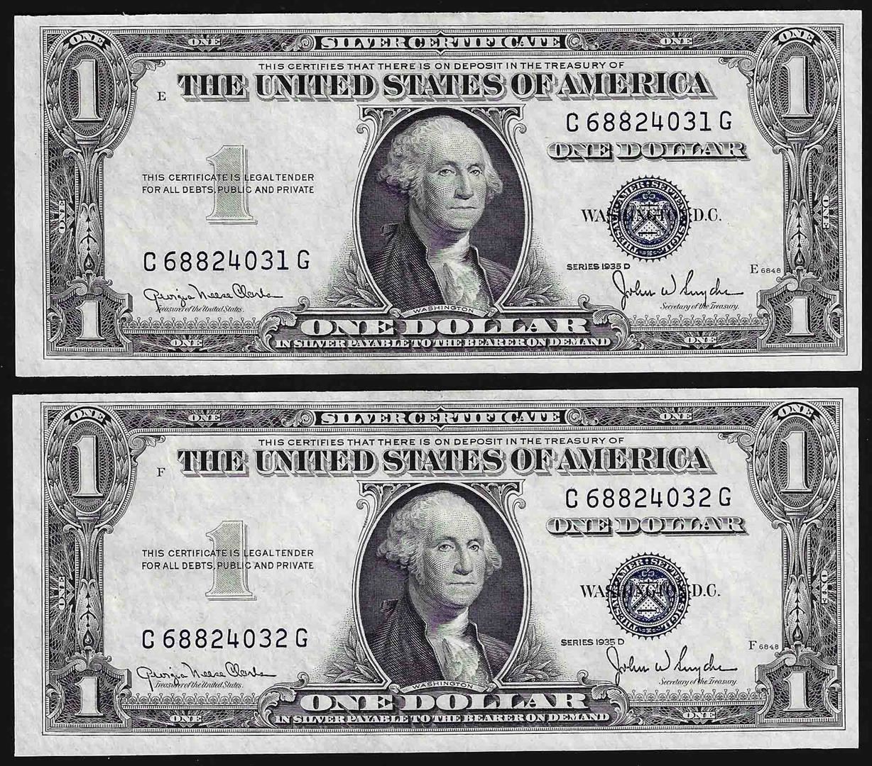 Lot of (2) Consecutive 1935D $1 Silver Certificate Notes Narrow Uncirculated