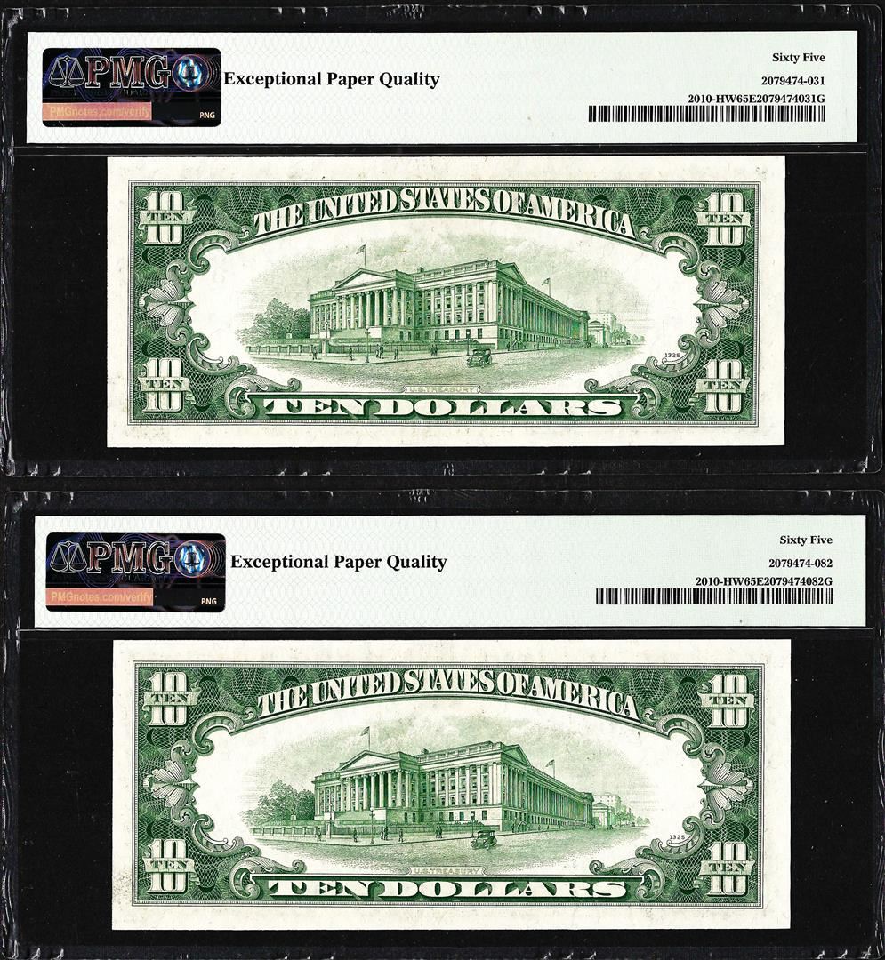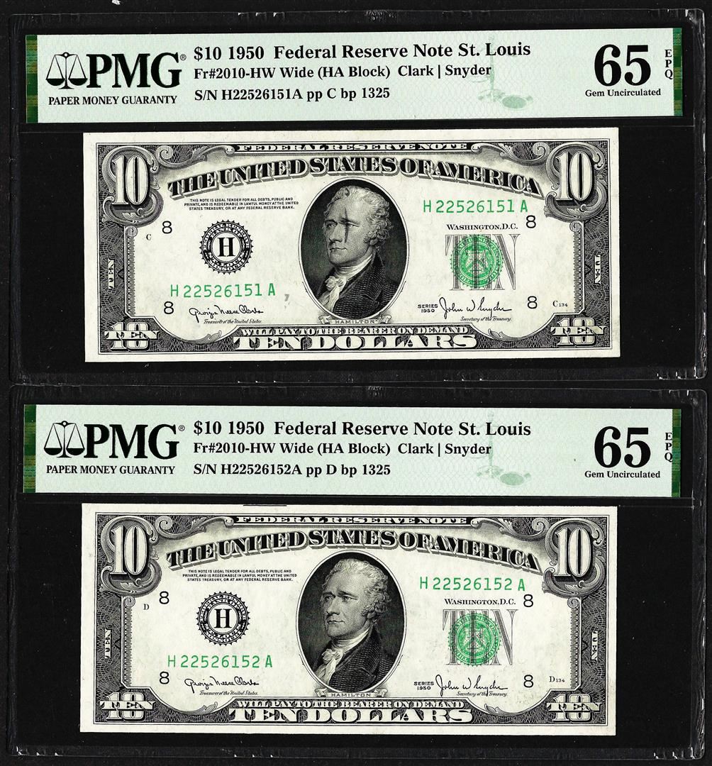 Lot of (2) Consecutive 1950 $10 Federal Reserve Notes STL PMG Gem Uncirculated 65EPQ