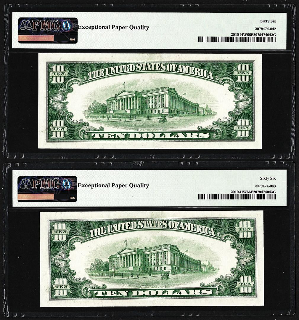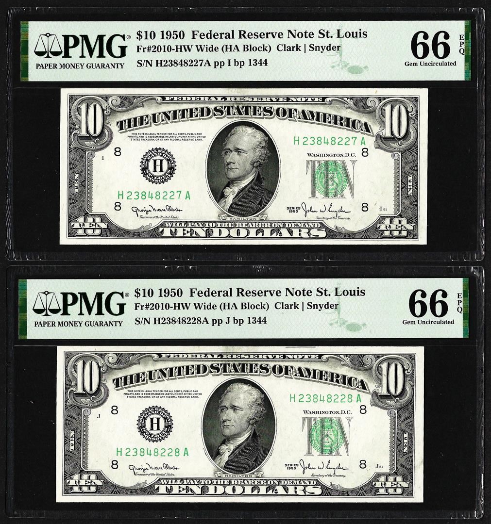 Lot of (2) Consecutive 1950 $10 Federal Reserve Notes STL PMG Gem Uncirculated 66EPQ
