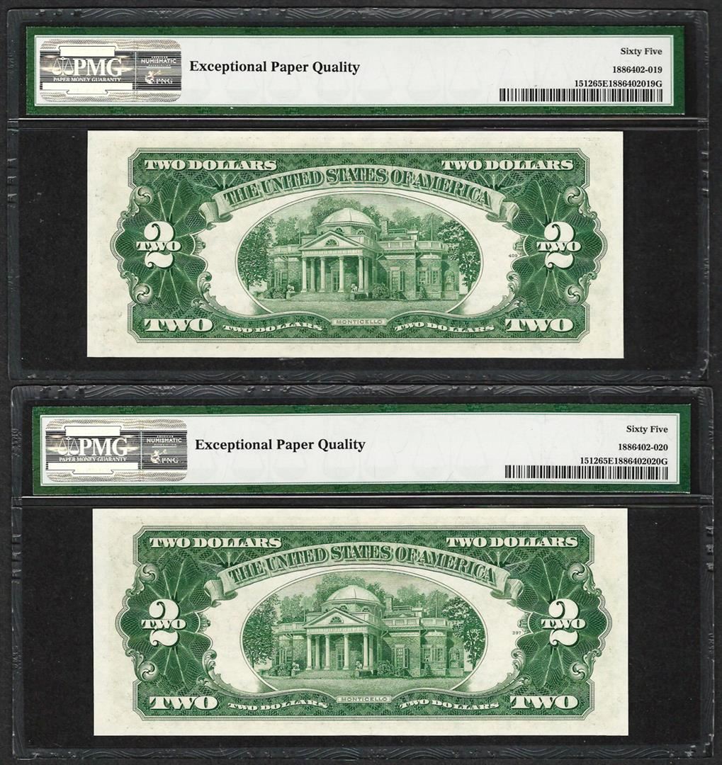 One Lot of (2) Consecutive 1953C $2 Legal Tender Notes Fr.1512 PMG Gem Uncirculated 65EPQ. PMG Certified.
