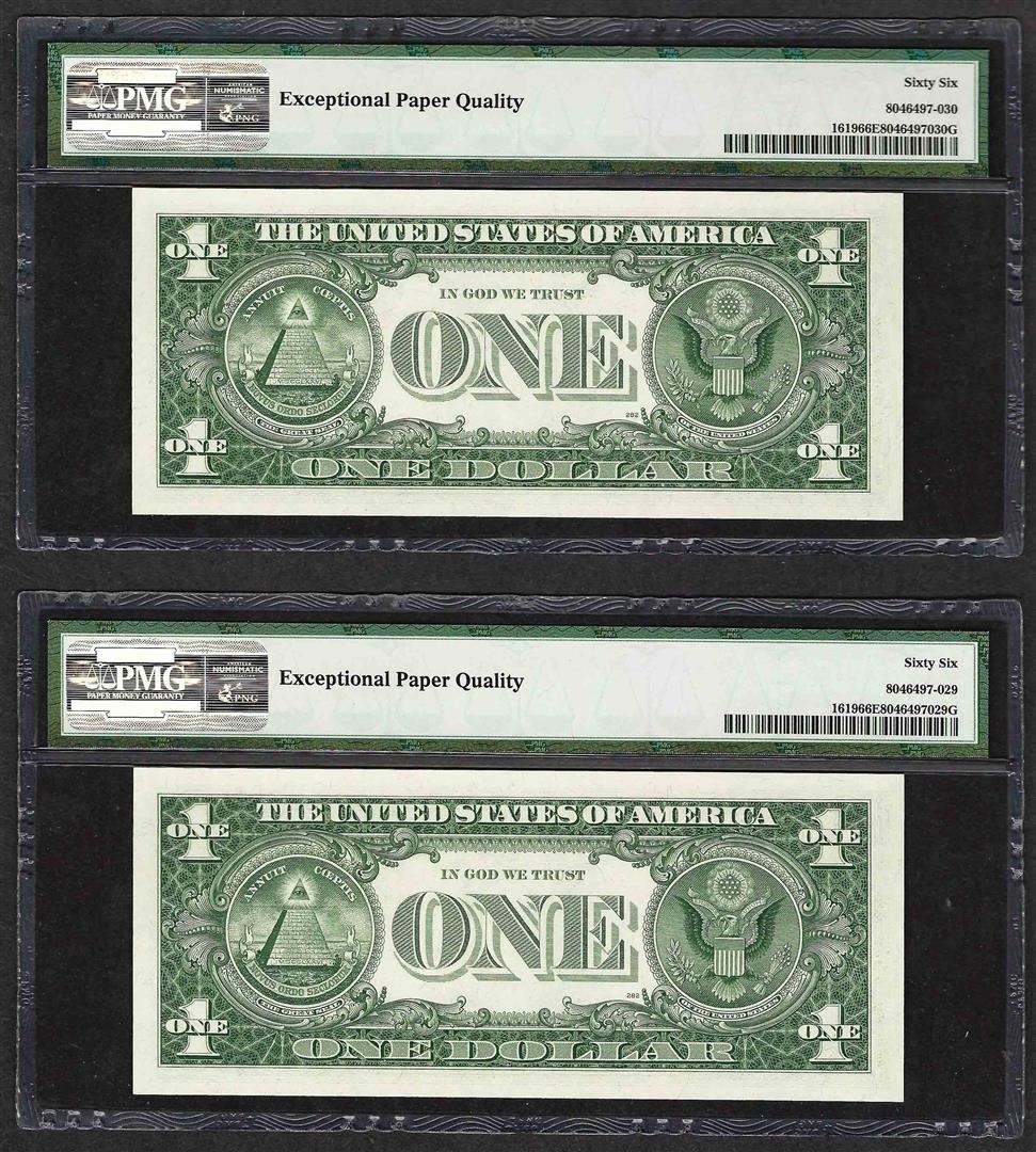 Lot of (2) Consecutive 1957 $1 Silver Certificate Notes PMG Gem Uncirculated 66E