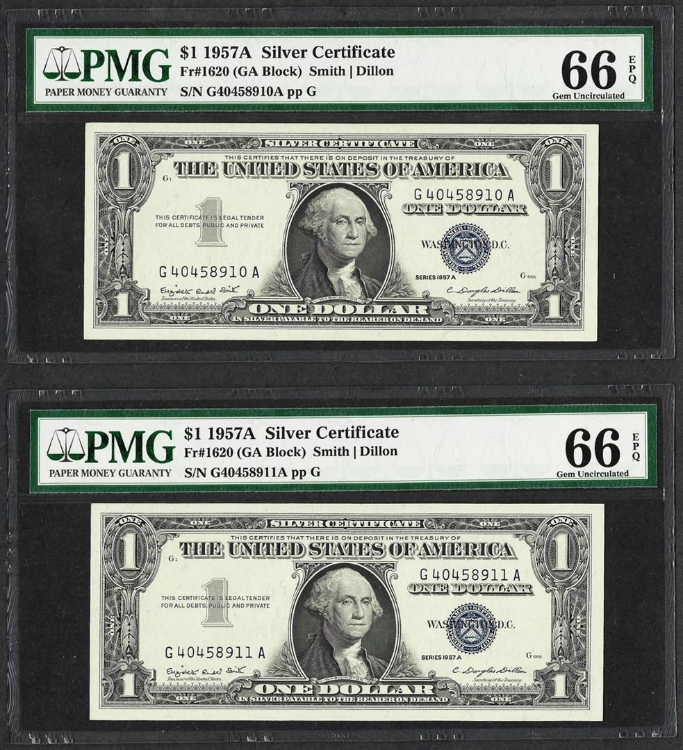 Lot of (2) Consecutive 1957A $1 Silver Certificate Notes PMG Gem Uncirculated 66