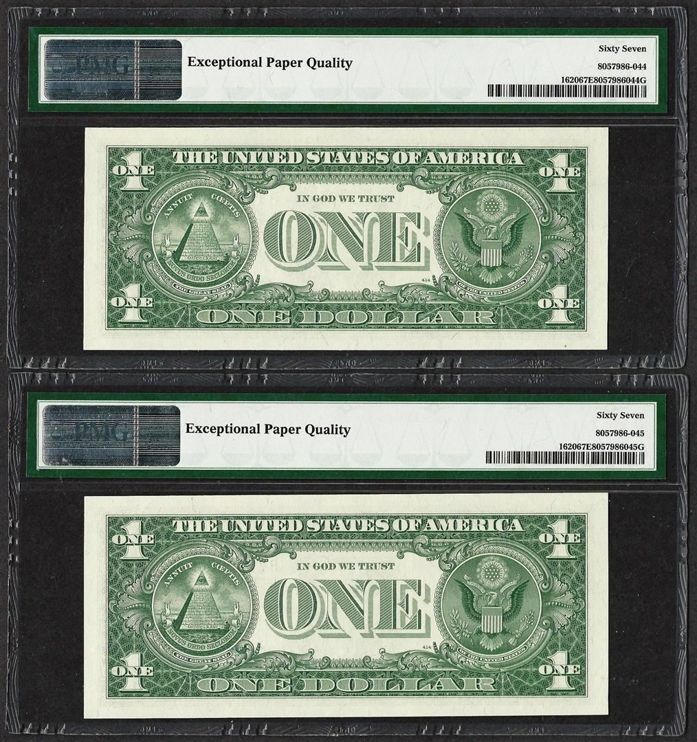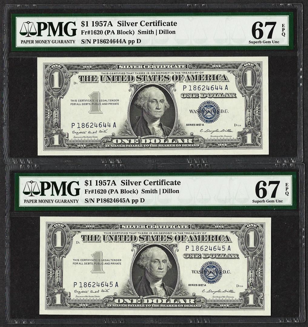 Lot of (2) Consecutive 1957A $1 Silver Certificate Notes PMG Superb Gem Unc. 67E