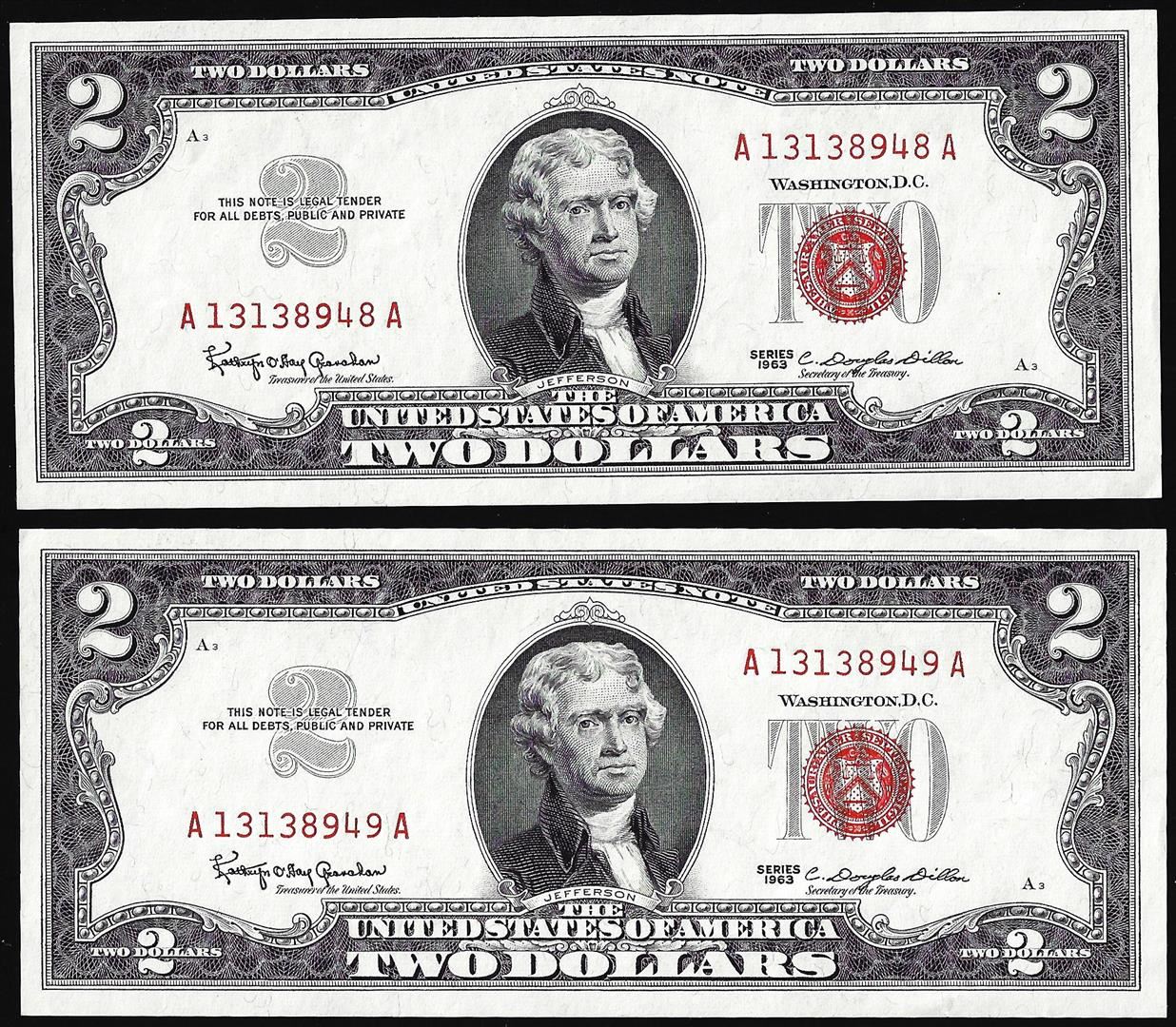 One Lot of (2) Consecutive 1963 $2 Legal Tender Notes.