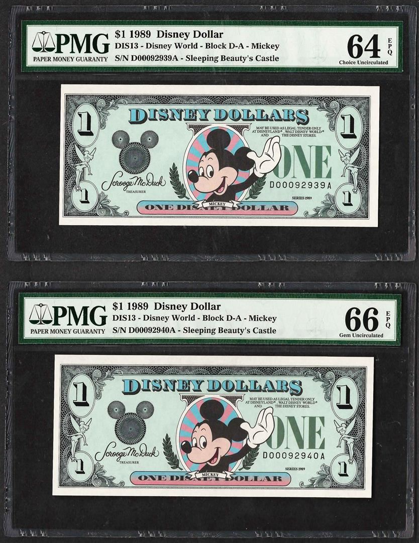 One Lot of (2) Consecutive 1989 $1 Disney Dollars Notes PMG Choice Uncirculated 64EPQ.