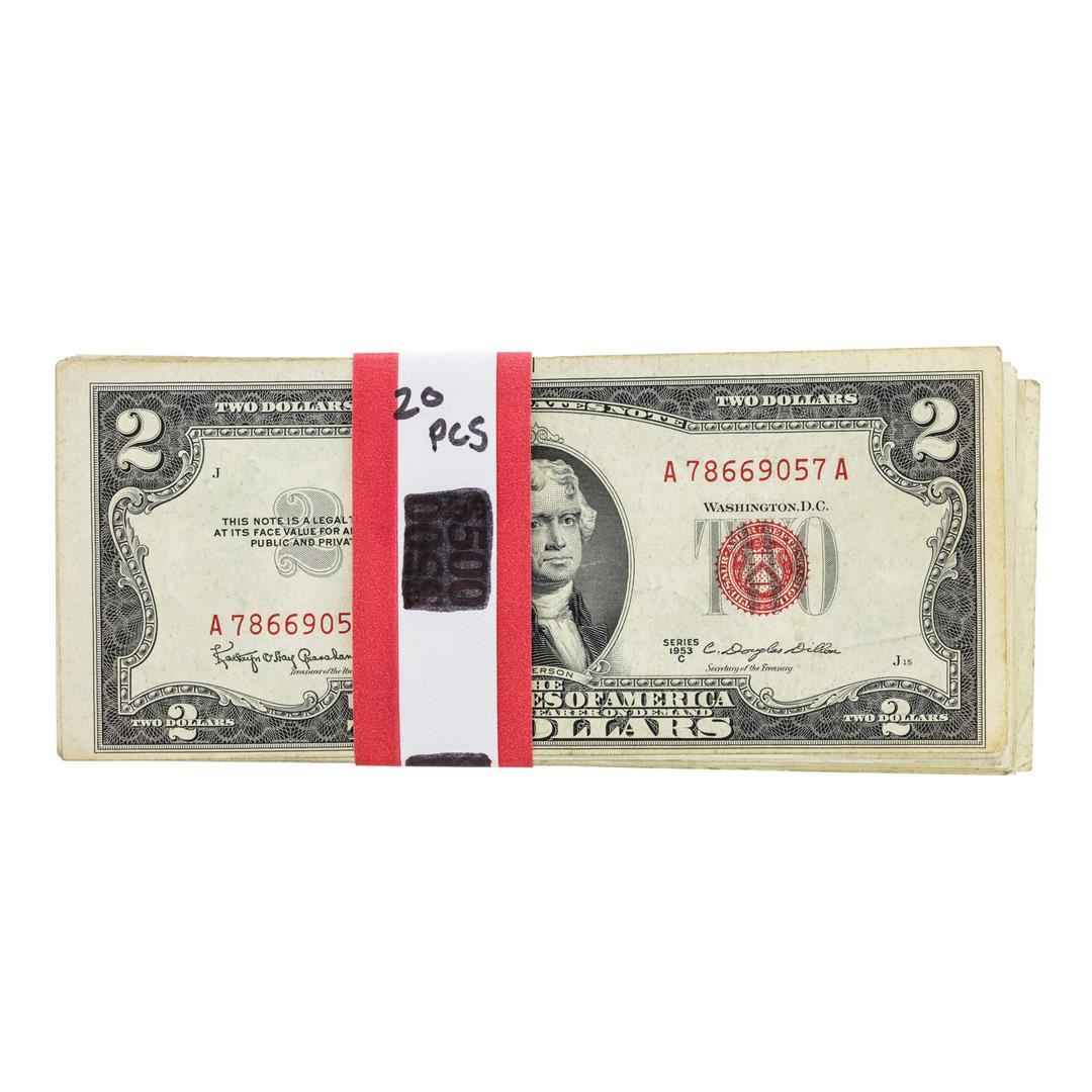 One Lot of (20) 1963 $2 Legal Tender Notes - Circulated. These notes are from Very Fine to Extra Fine condition.