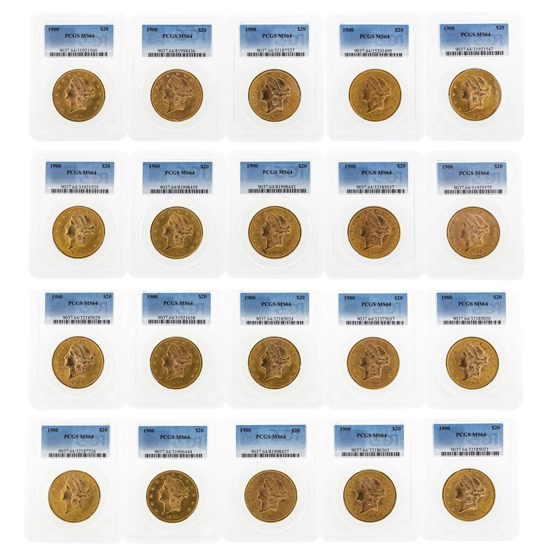 One Lot of (20) $20 Liberty Head Double Eagle Gold Coins PCGS MS64. 1900 rarely encountered, a roll of 20, 1900 $20 libertys, all PCGS certified, MS-64. PCGS Graded.