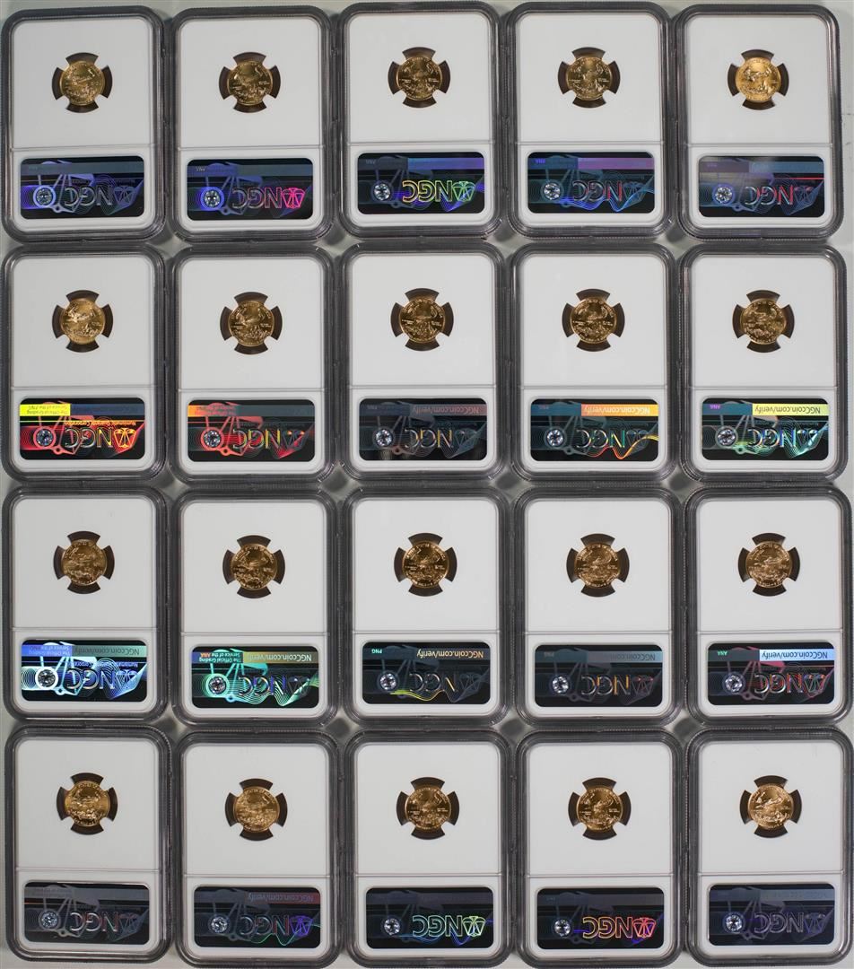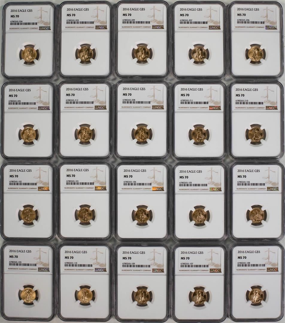 One Lot of (20) 2016 $5 American Gold Eagle Coins NGC MS70. NGC Certified.