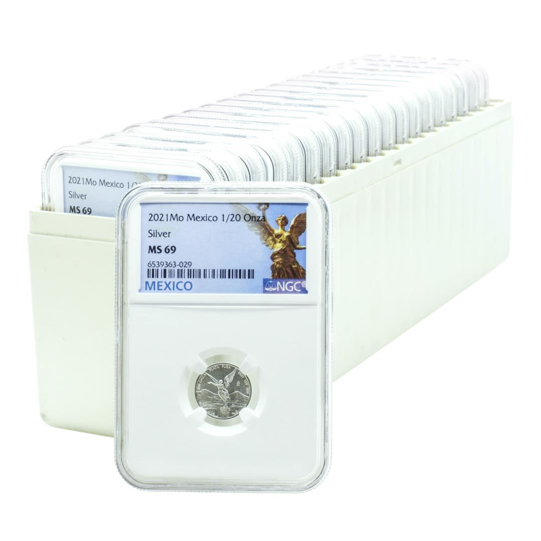 One Lot of (20) 2021-Mo Mexico 1/20 oz Silver Libertad Coins NGC MS69. NGC Certified.
