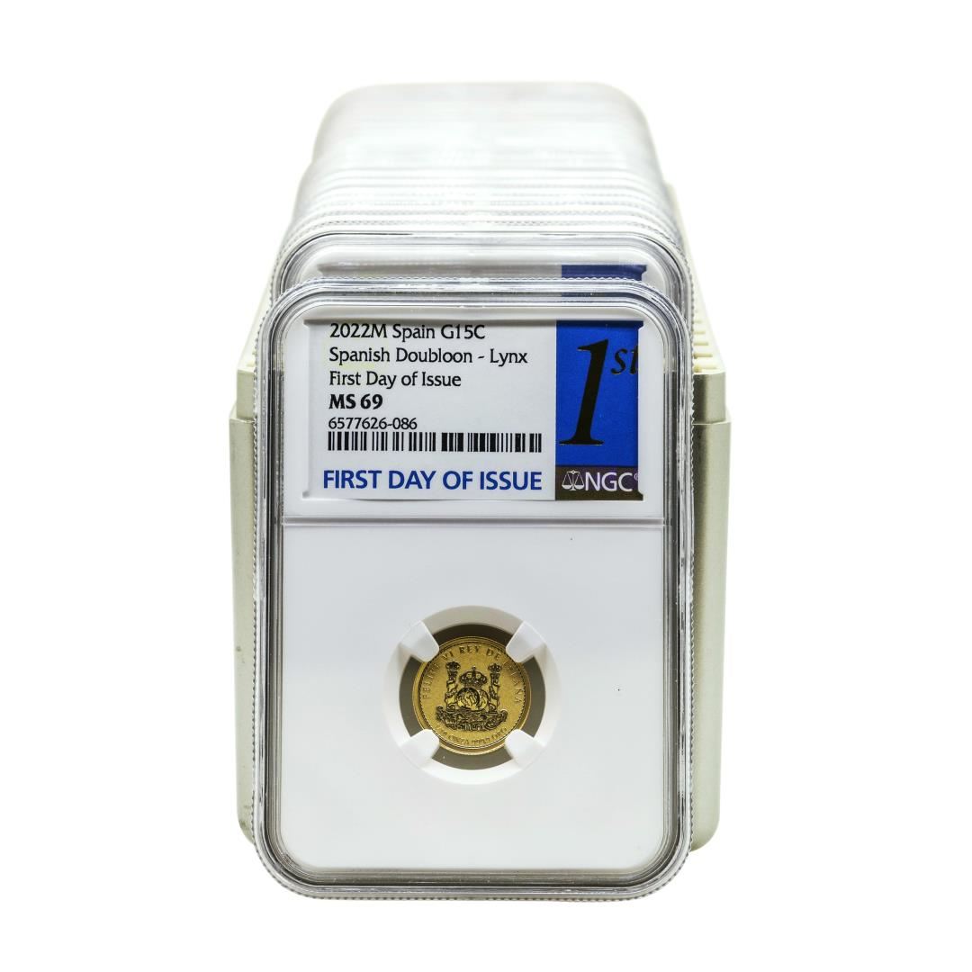 One Lot of (20) 2022M Spain 15 Euro Cent Lynx Gold Doubloon Coins NGC MS69 FDOI. NGC Certified.