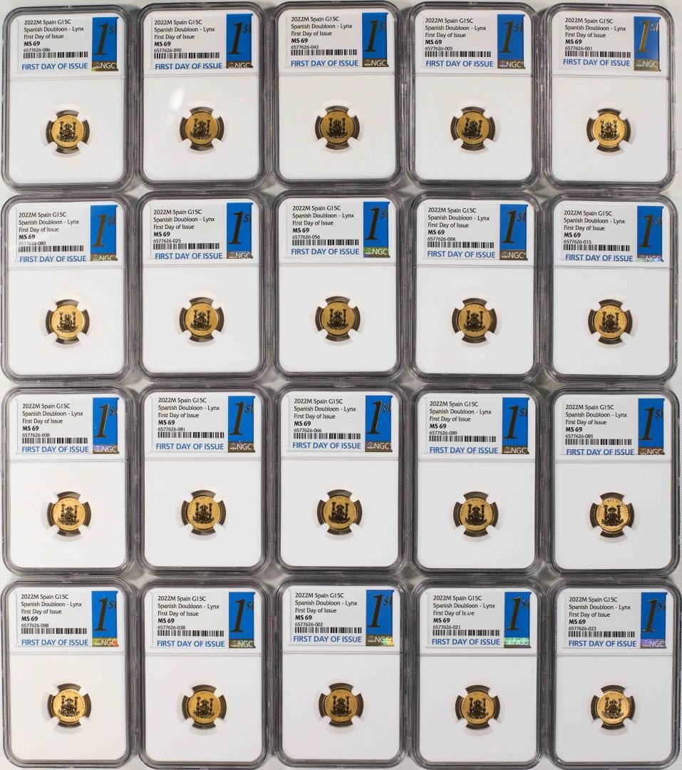 One Lot of (20) 2022M Spain 15 Euro Cent Lynx Gold Doubloon Coins NGC MS69 FDOI. NGC Certified.