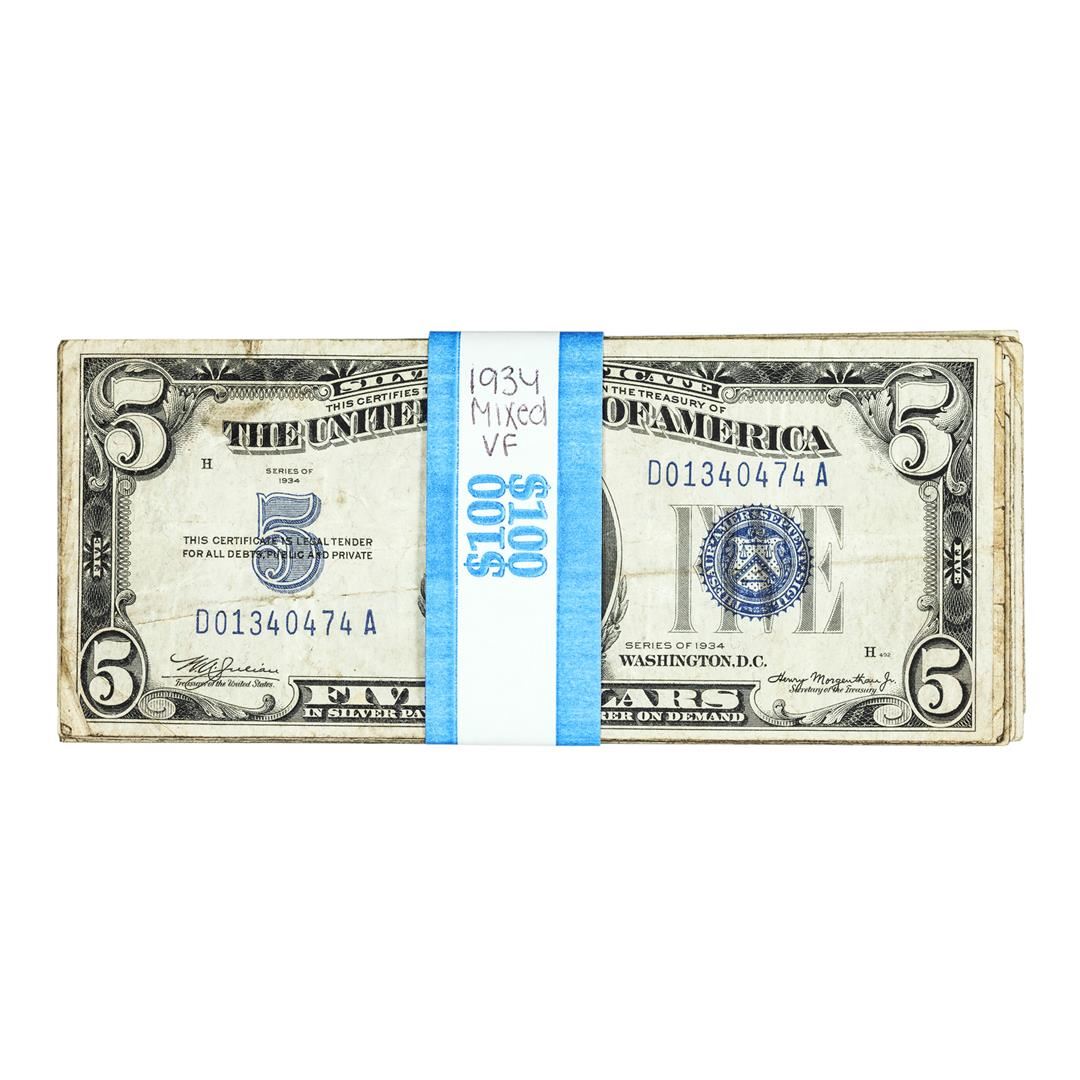 Lot of (20) Mixed Series 1934 $5 Silver Certificate Notes - Very Fine