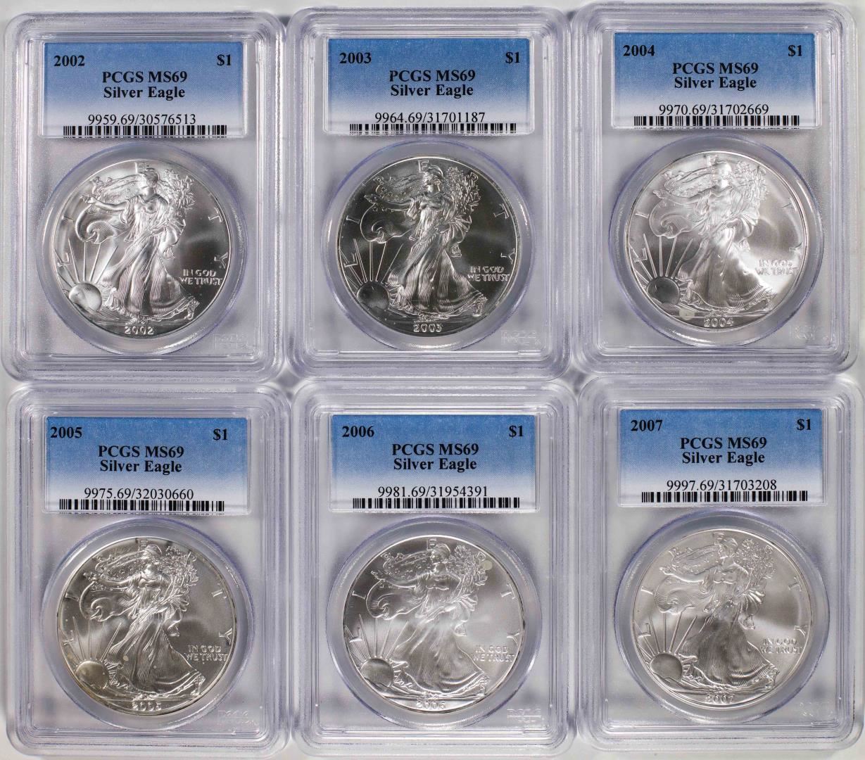 One Lot of 2002-2007 $1 American Silver Eagle Coins PCGS MS69. PCGS Graded.