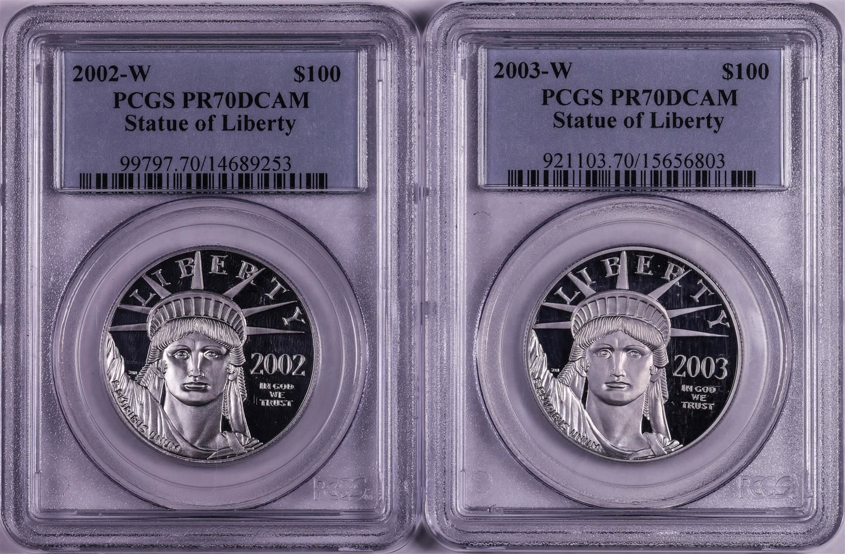 One Lot of 2002-W & 2003-W $100 Proof Platinum American Eagle Coins PCGS PR70DCAM. PCGS Graded.