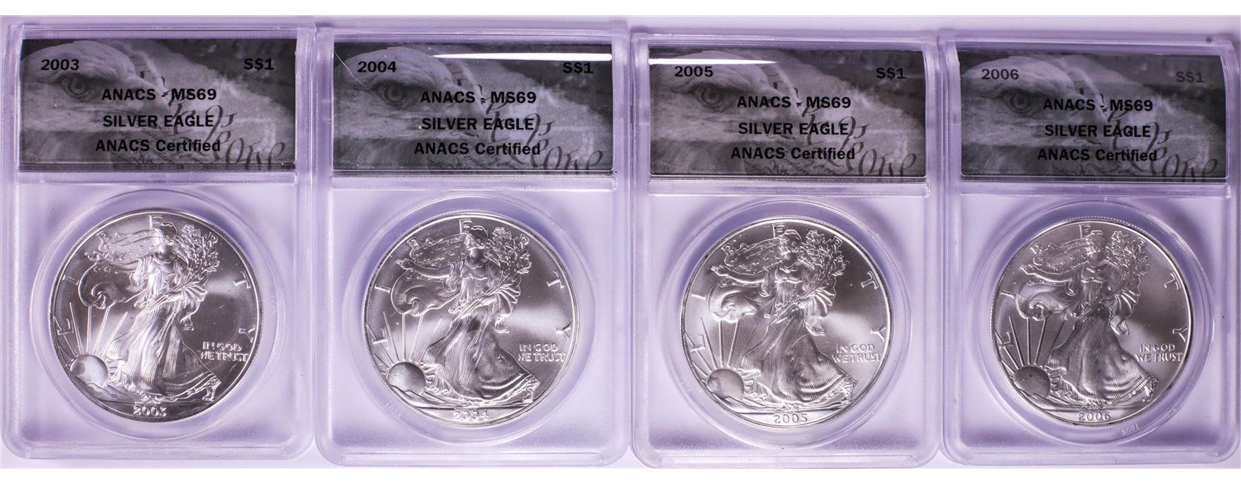 One Lot of 2003-2006 $1 American Silver Eagle Coins ANACS MS69. ANACS Certified.