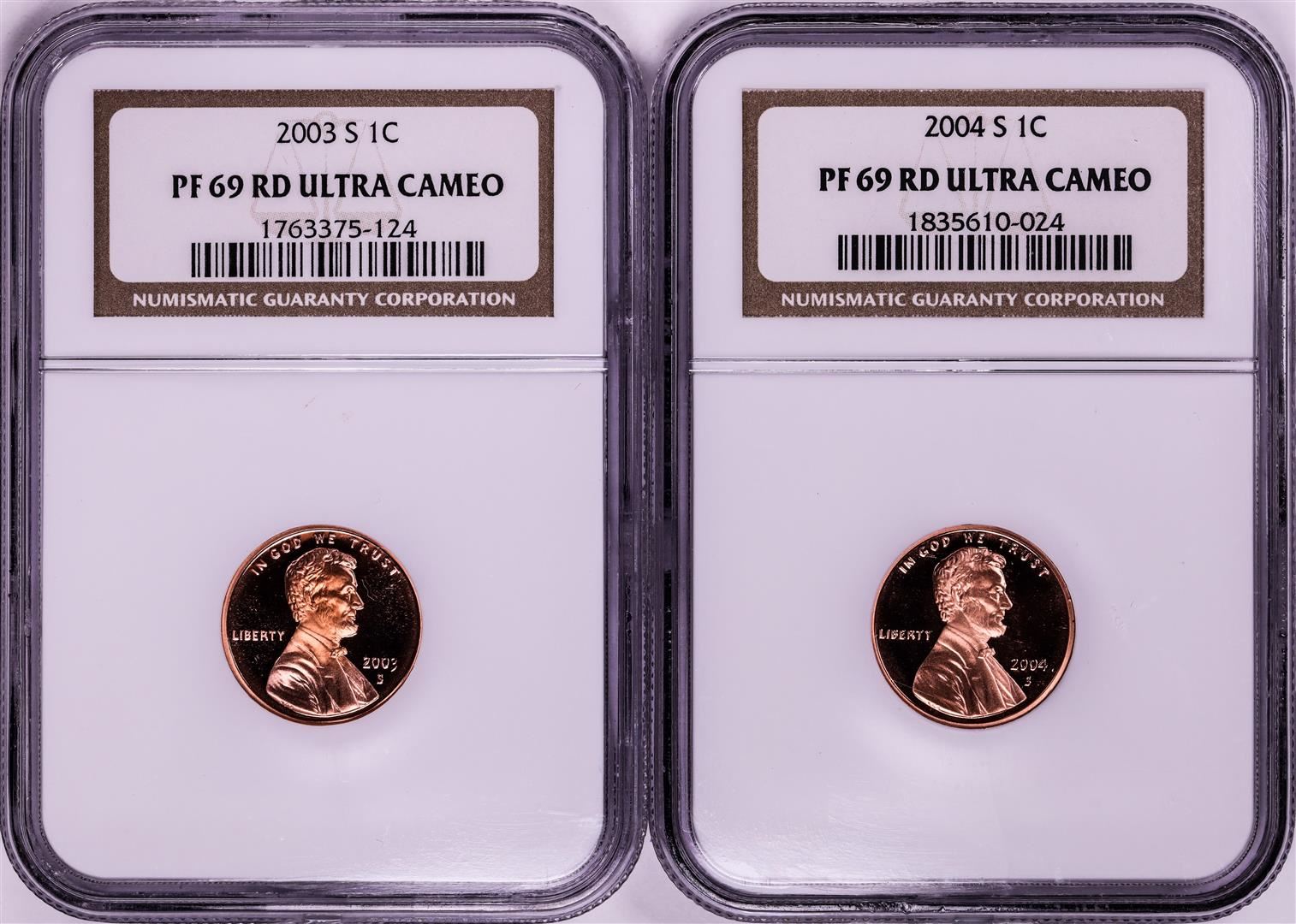 One Lot of 2003-S & 2004-S Proof Lincoln Memorial Cent Coins NGC PF69RD Ultra Cameo. NGC Certified.