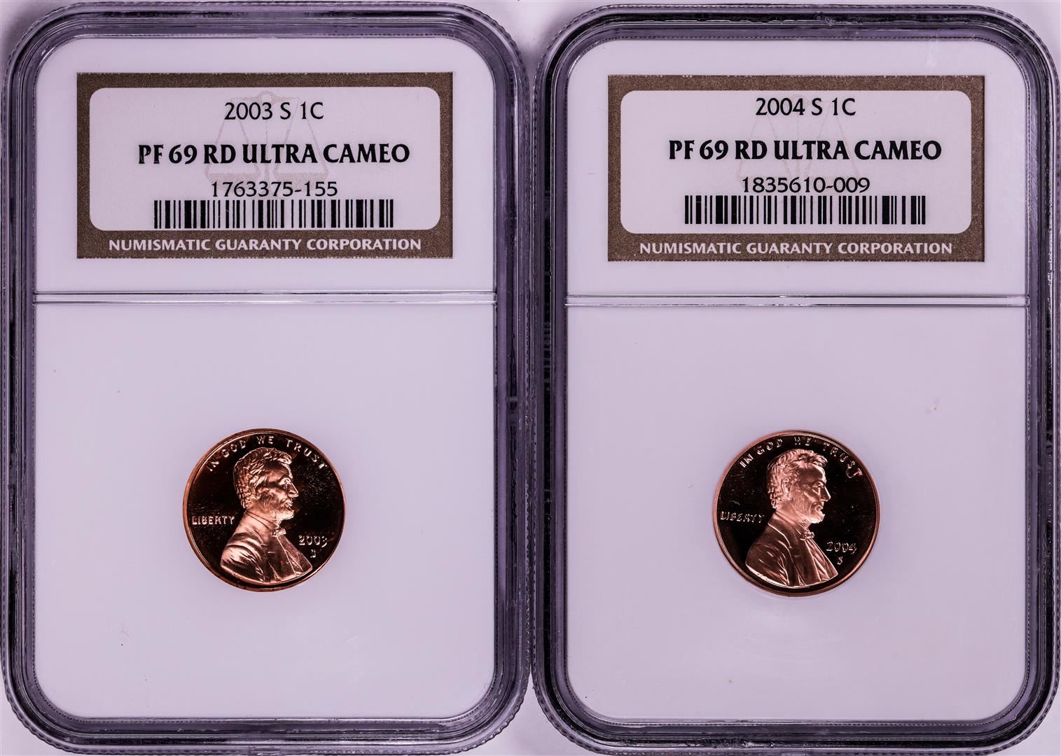 One Lot of 2003-S & 2004-S Proof Lincoln Memorial Cent Coins NGC PF69RD Ultra Cameo. NGC Certified.