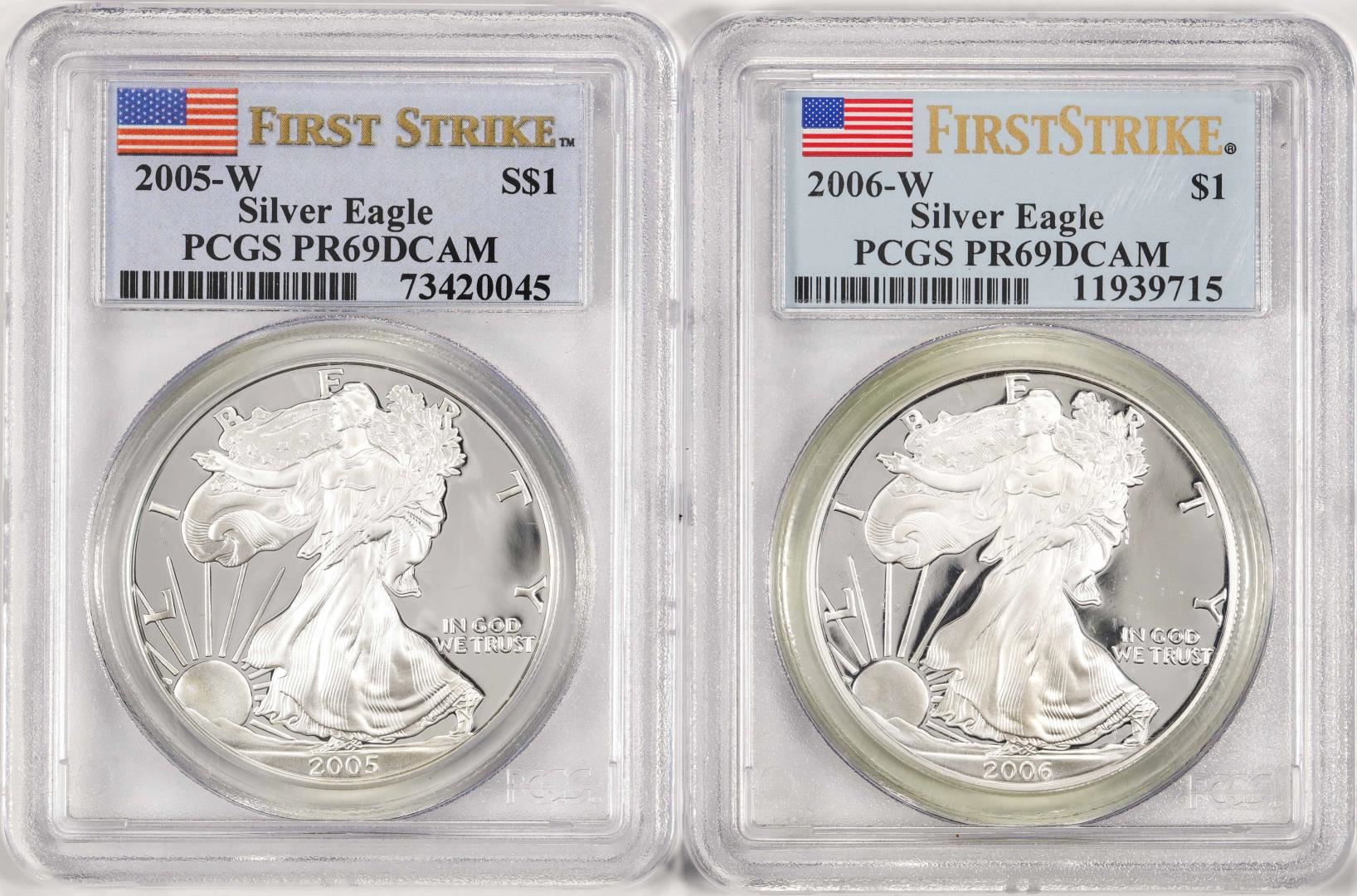 Lot of 2005-W & 2006-W $1 Proof American Silver Eagle Coins PCGS PR69DCAM First Strike