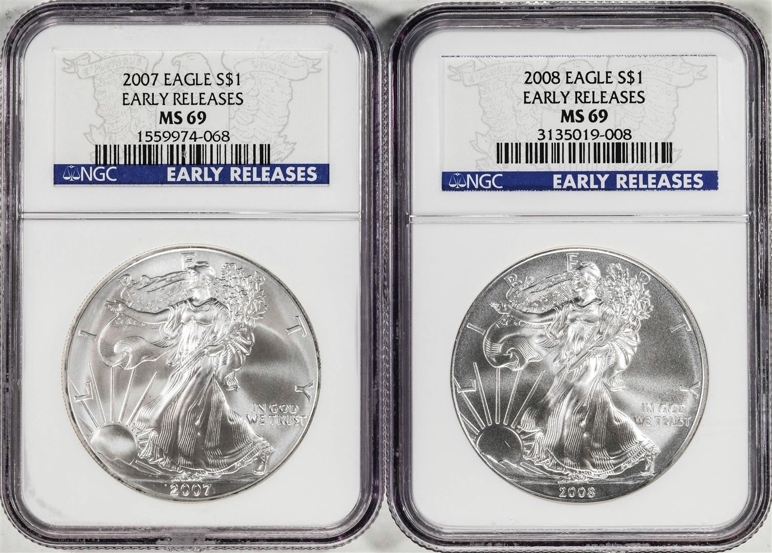 One Lot of 2007-2008 $1 American Silver Eagle Coins NGC MS69 Early Releases. NGC Certified.