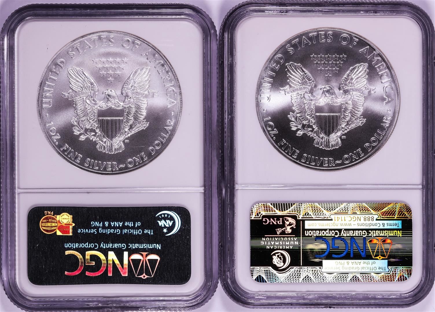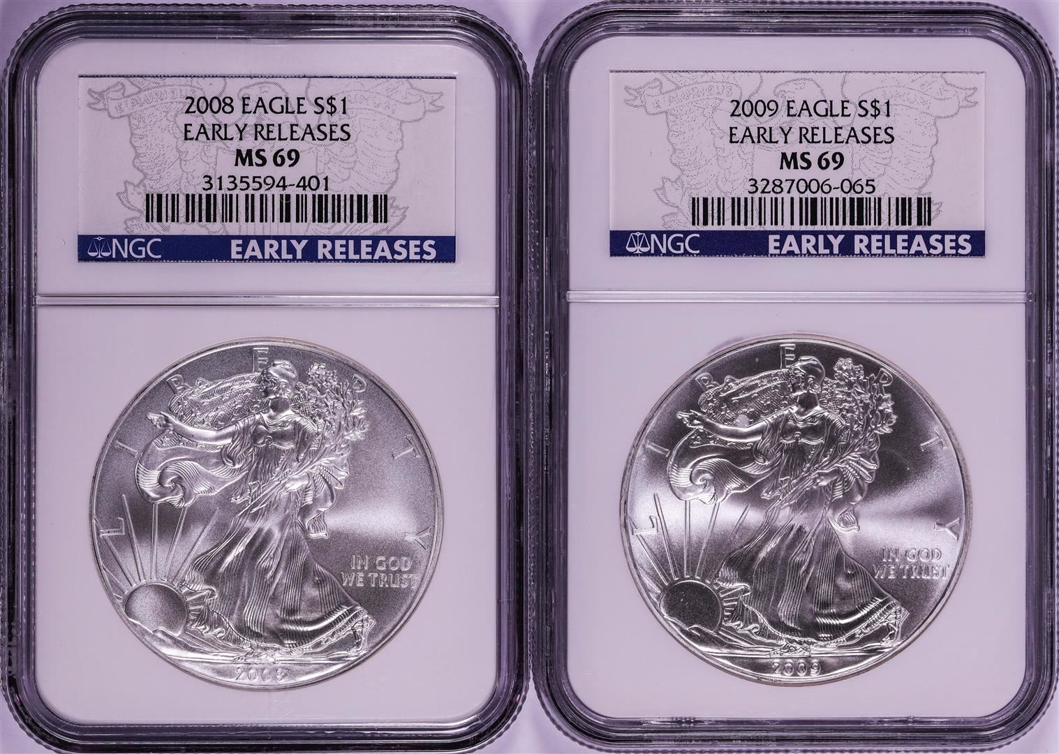 One Lot of 2008-2009 $1 American Silver Eagle Coins NGC MS69 Early Releases. NGC Certified.