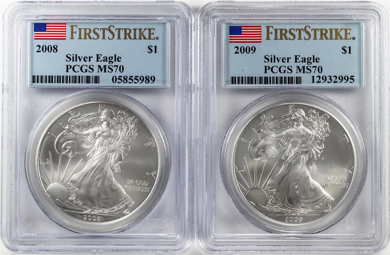 Lot of 2008-2009 $1 American Silver Eagle Coins PCGS MS70 First Strike
