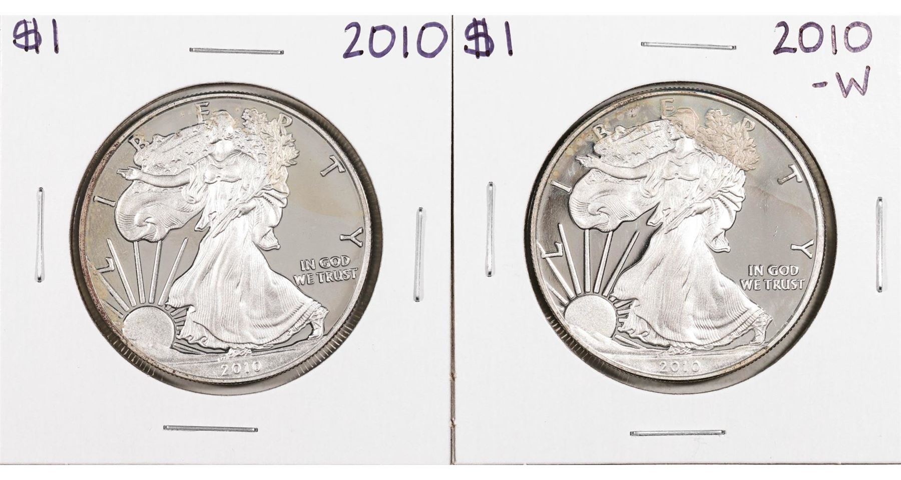 One Lot of 2010 & 2010-W $1 Proof American Silver Eagle Coins.