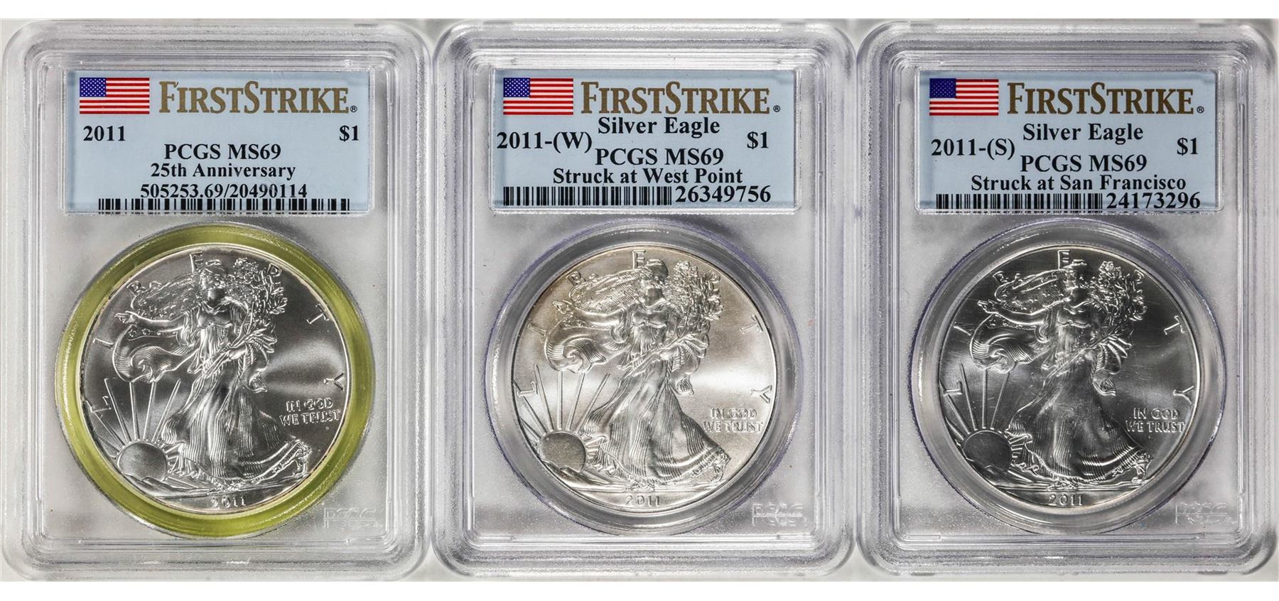 One Lot of 2011-P/S/W $1 American Silver Eagle Coins PCGS MS69 First Strike. PCGS Graded.