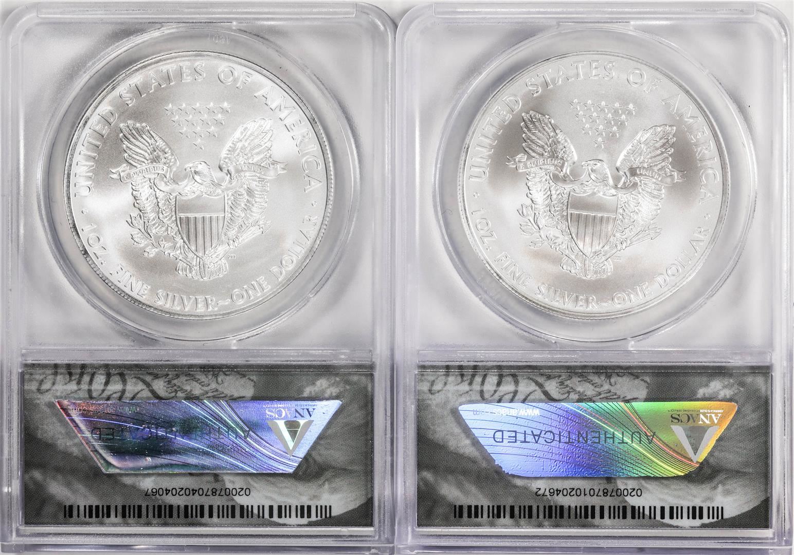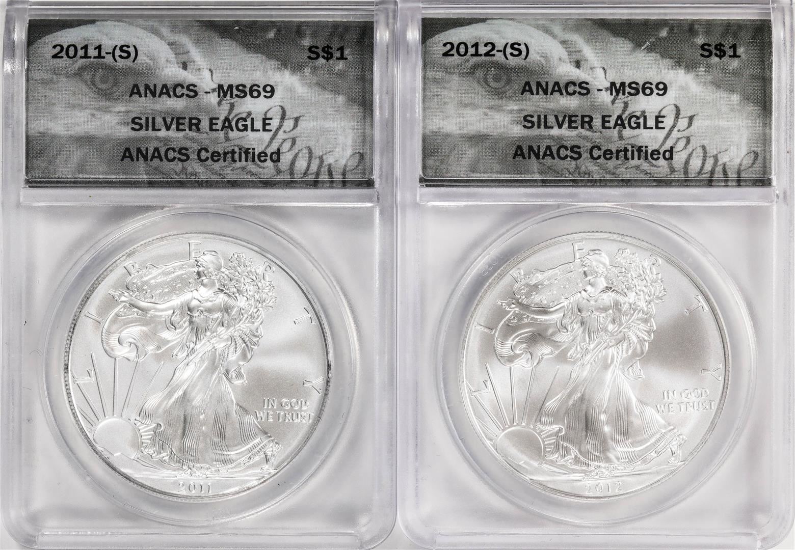 One Lot of 2011-(S) & 2012-(S) $1 American Silver Eagle Coins ANACS MS69 San Francisco. ANACS Certified.