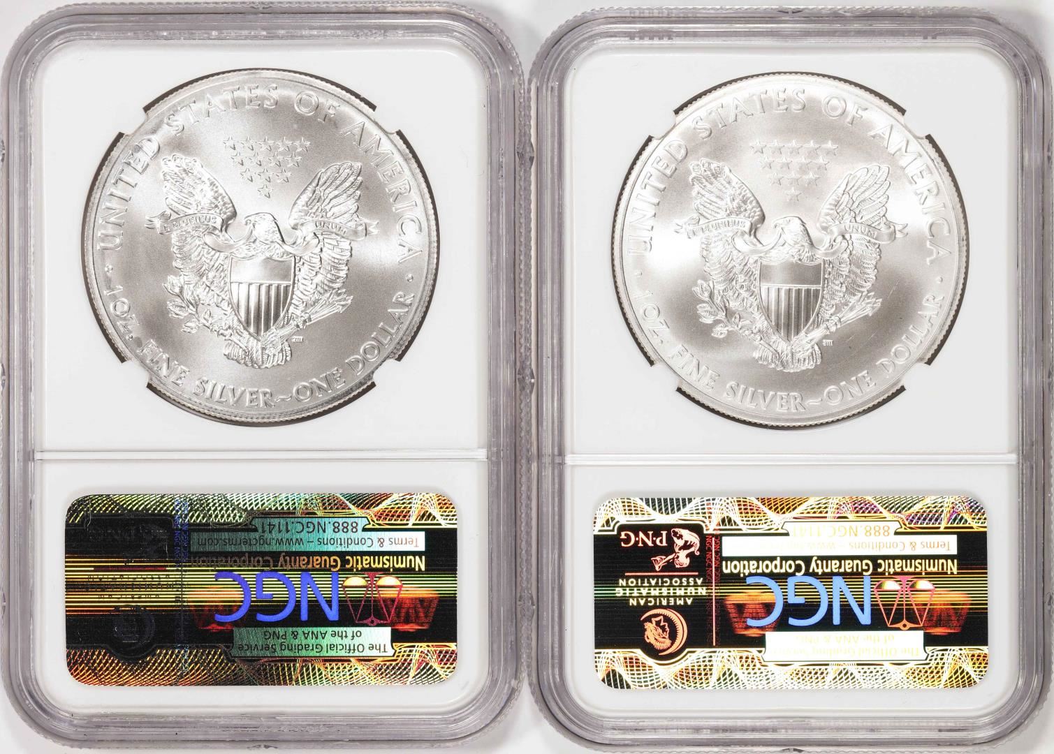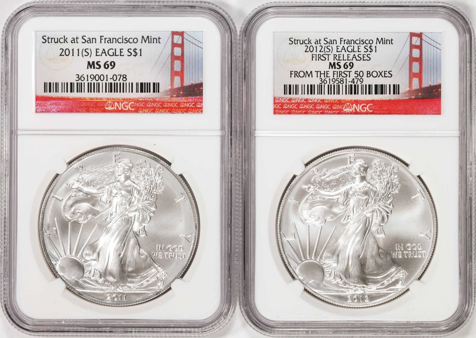 One Lot of 2011(S) & 2012(S) $1 American Silver Eagle Coins NGC MS69. NGC Certified.