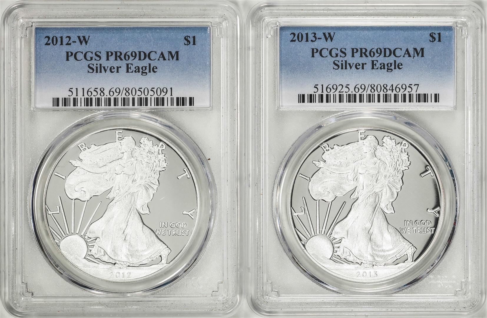 One Lot of 2012-W & 2013-W $1 Proof American Silver Eagle Coins PCGS PR69DCAM. PCGS Graded.