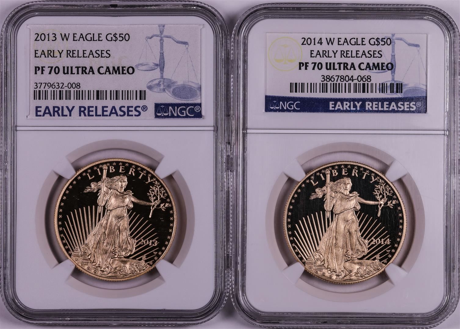 One Lot of 2013-W & 2014-W $50 Proof American Gold Eagle Coins NGC PF70 Ultra Cameo ER. NGC Certified.