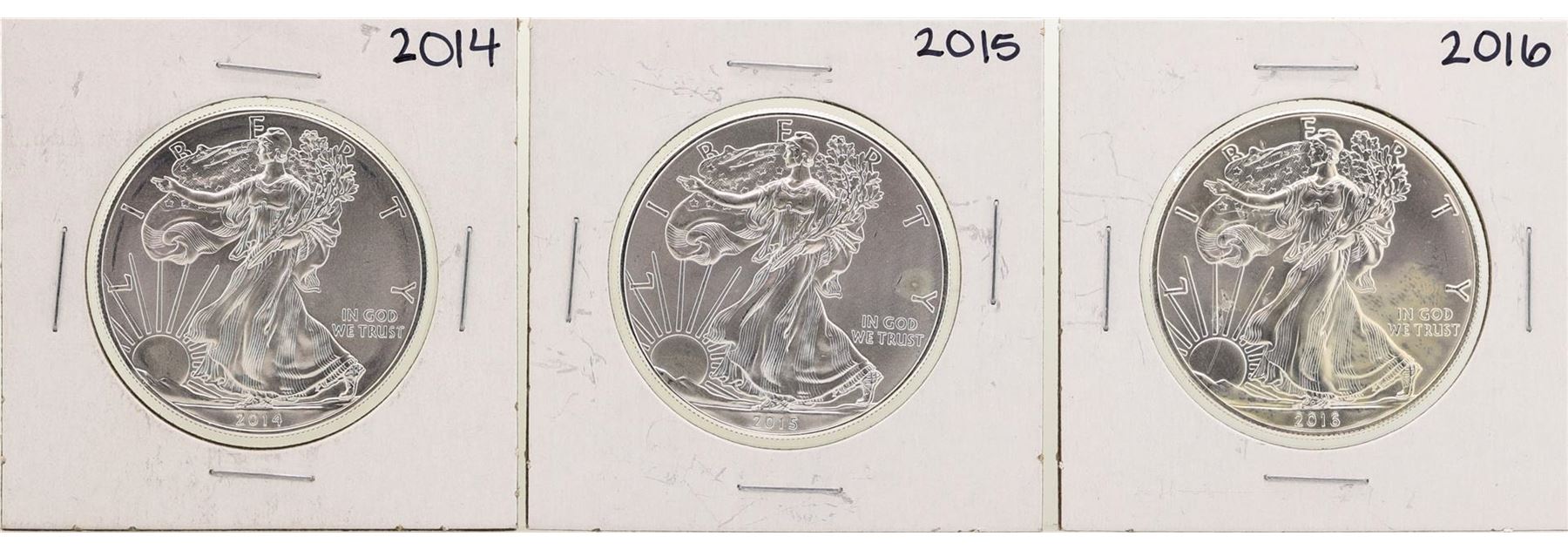 One Lot of 2014-2016 $1 American Silver Eagle Coins.