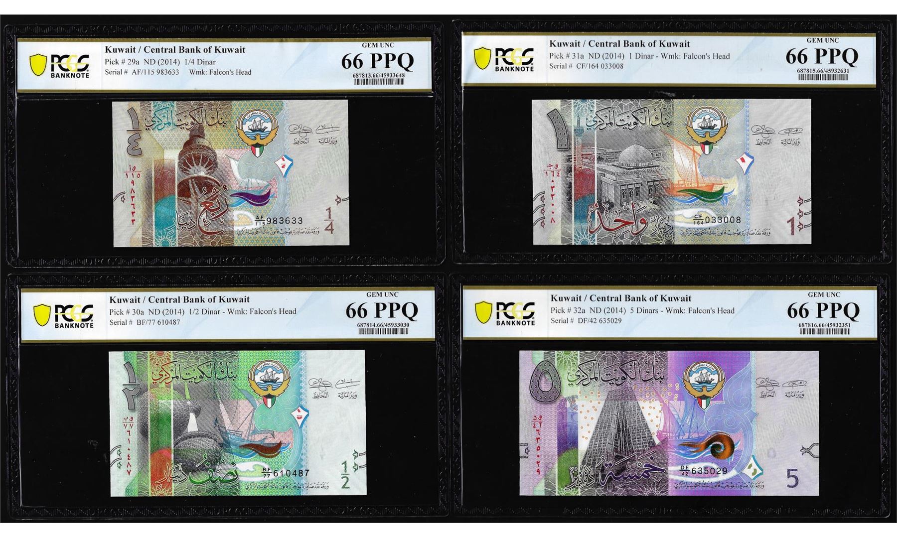 One Lot of 2014 Kuwait 1/4, 1/2, 1 & 5 Dinar Notes PCGS Gem Uncirculated 66PPQ. PCGS Graded.