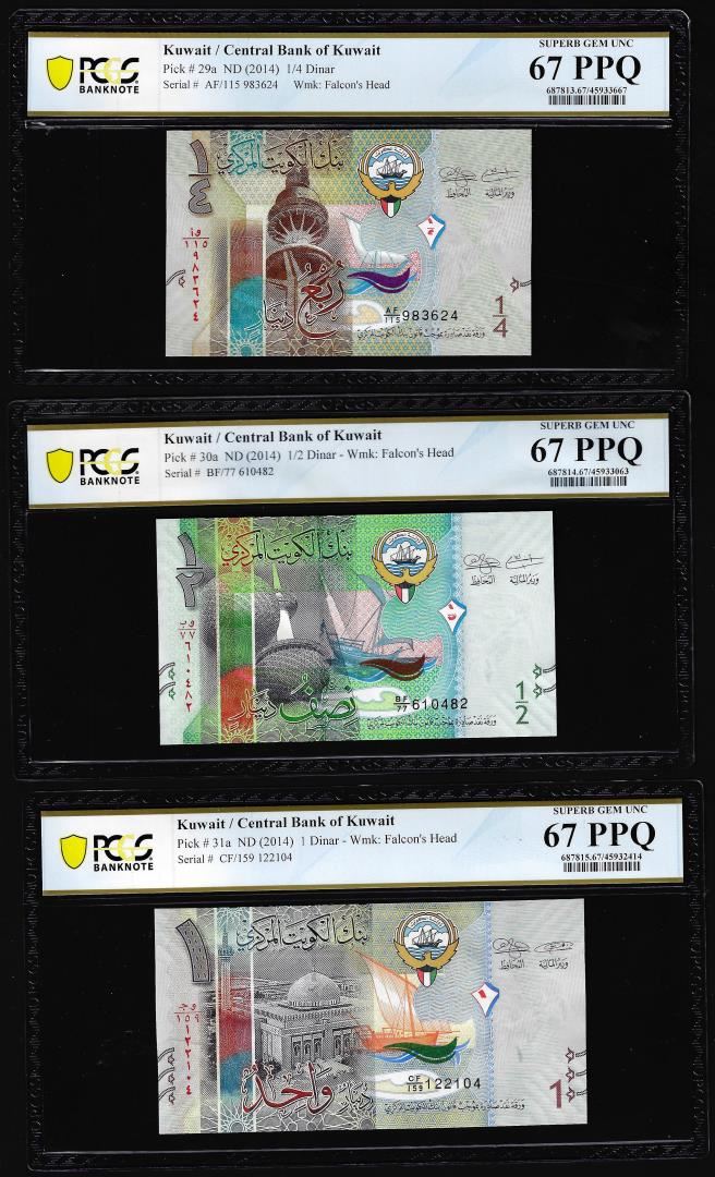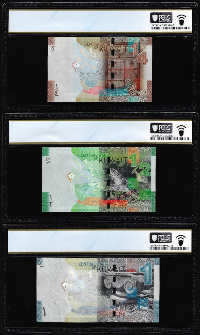 One Lot of 2014 Kuwait 1/4, 1/2 & 1 Dinar Notes PCGS Superb Gem Uncirculated 67PPQ. PCGS Graded.