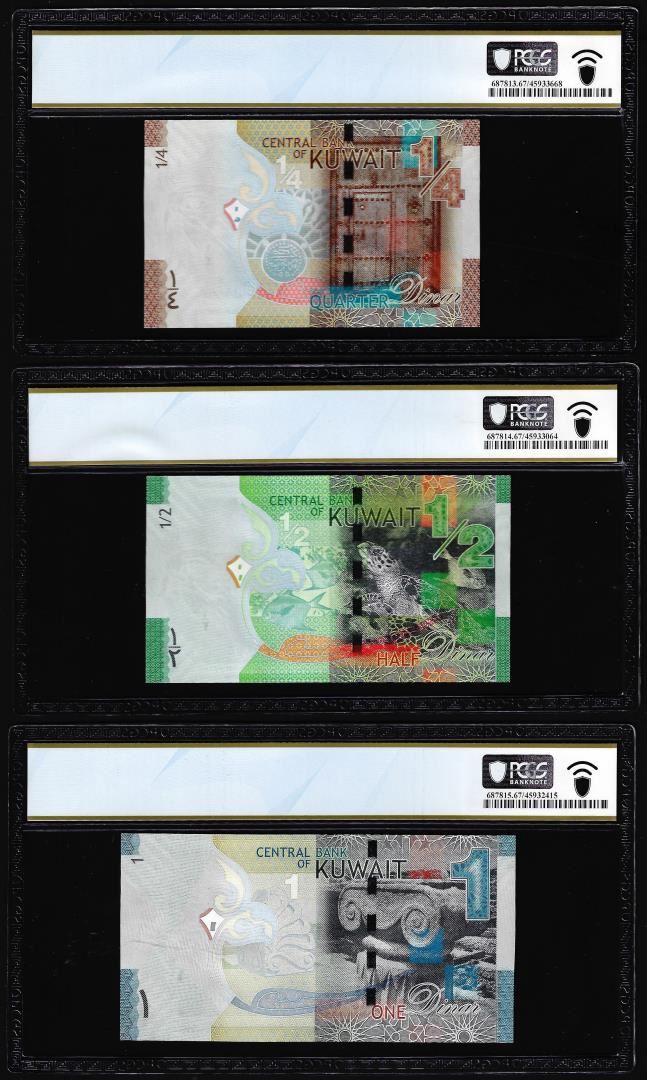 One Lot of 2014 Kuwait 1/4, 1/2 & 1 Dinar Notes PCGS Superb Gem Uncirculated 67PPQ. PCGS Graded.