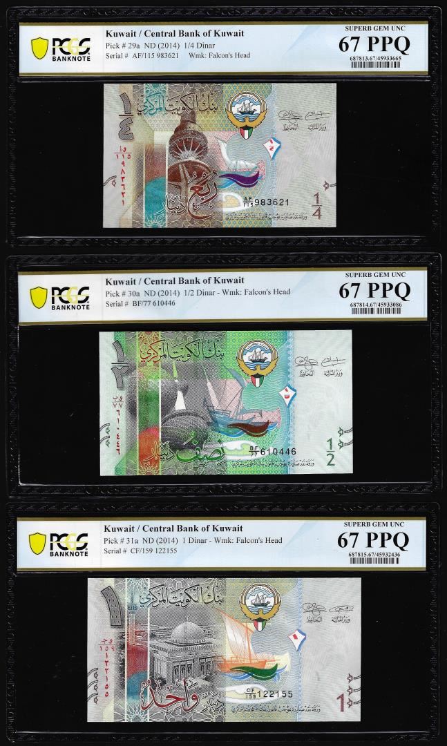 One Lot of 2014 Kuwait 1/4, 1/2 & 1 Dinar Notes PCGS Superb Gem Uncirculated 67PPQ. PCGS Graded.