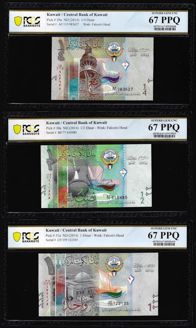 One Lot of 2014 Kuwait 1/4, 1/2 & 1 Dinar Notes PCGS Superb Gem Uncirculated 67PPQ. PCGS Graded.