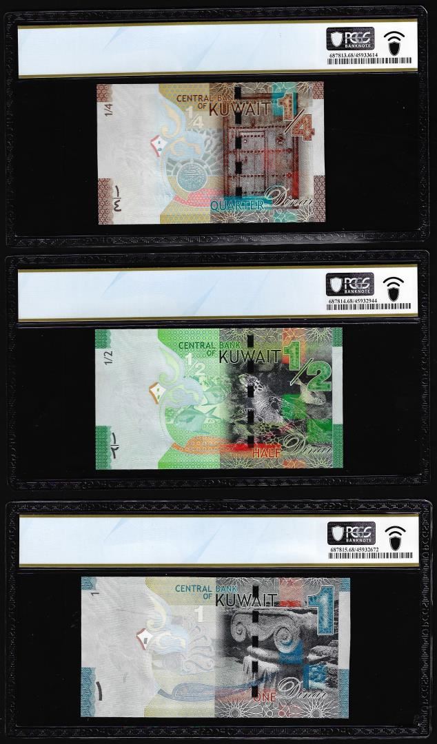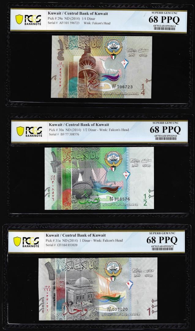 One Lot of 2014 Kuwait 1/4, 1/2 & 1 Dinar Notes PCGS Superb Gem Uncirculated 68PPQ. PCGS Graded.
