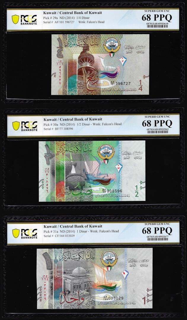 One Lot of 2014 Kuwait 1/4, 1/2 & 1 Dinar Notes PCGS Superb Gem Uncirculated 68PPQ. PCGS Graded.
