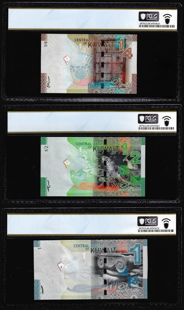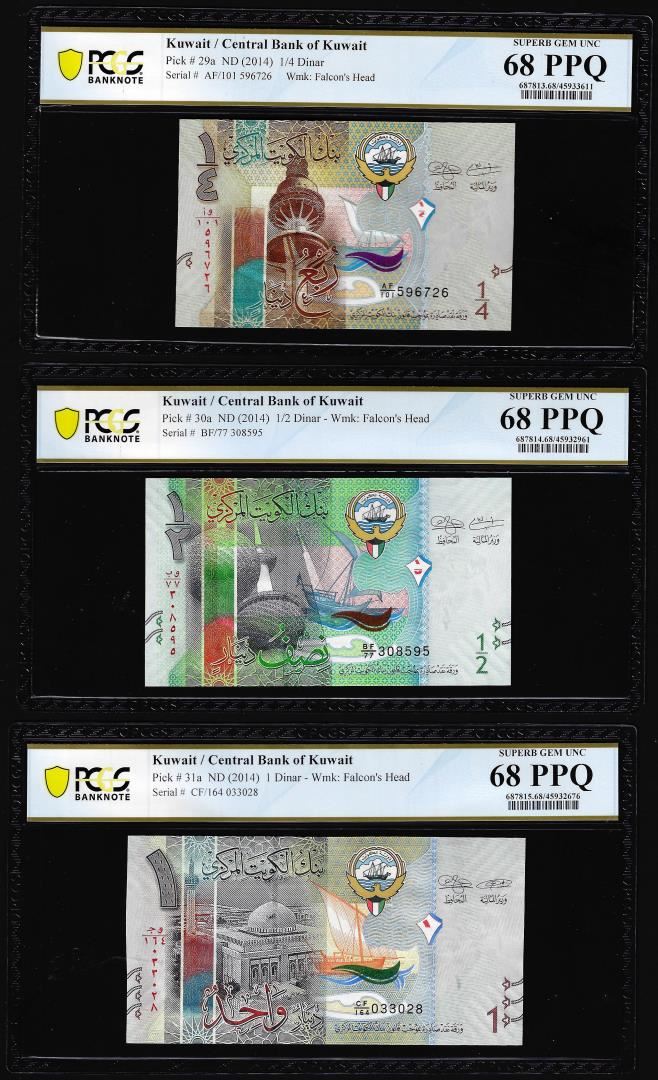 One Lot of 2014 Kuwait 1/4, 1/2 & 1 Dinar Notes PCGS Superb Gem Uncirculated 68PPQ. PCGS Graded.