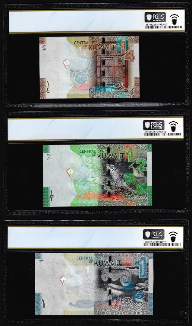 One Lot of 2014 Kuwait 1/4, 1/2 & 1 Dinar Notes PCGS Superb Gem Uncirculated 68PPQ. PCGS Graded.