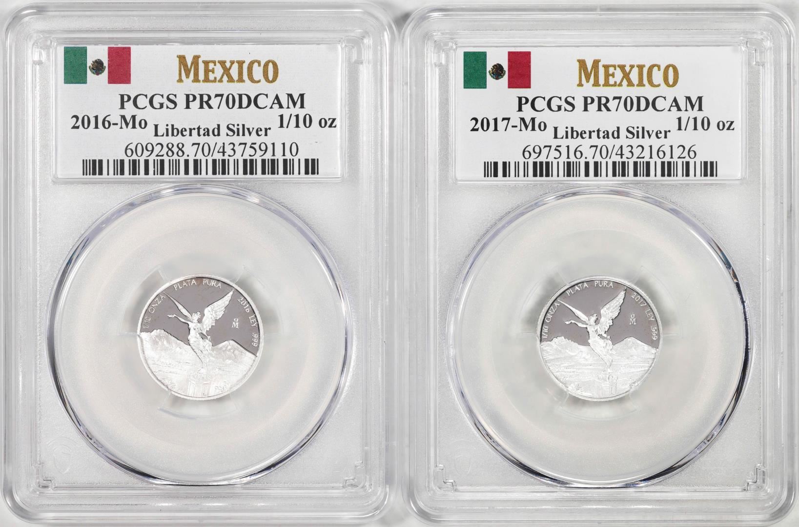 One Lot of 2016-2017-Mo Mexico Proof 1/10 oz Silver Libertad Coins PCGS PR70DCAM. PCGS Graded.