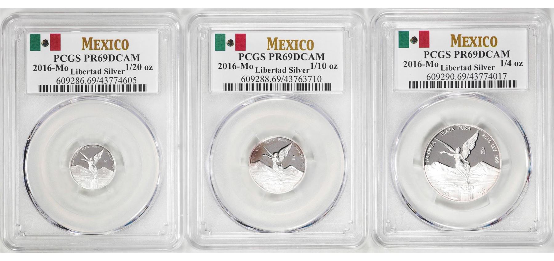 Lot of 2016-Mo Mexico Proof 1/20, 1/10 and 1/4 oz Silver Libertad Coins PCGS PR69DCAM